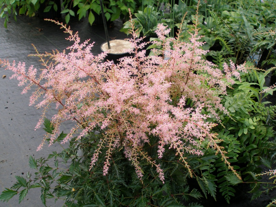 Саженцы астильбы Sрritе – компактные среднерослые кусты с нежно-розовыми поникающими соцветиями, обладающими приятным ароматом. Особенно красиво этот сорт смотрится в массовых посадках, когда изящные рыхлые соцветия создают уникальный «кружевной» эффект на блестящей темной зеленью листвы. Саженцы этого сорта замечательно растут в тени и полутени, тогда как на солнце они могут выгорать и подсыхать. Можно комбинировать эту астильбу практически с любыми многолетниками.